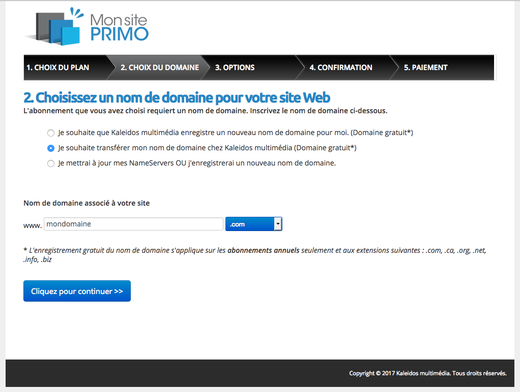 Notez que le nom de domaine gratuit s'applique sur les abonnements annuels seulement et aux extensions suivantes : .com, .ca, .org, .net, .info, .biz.
